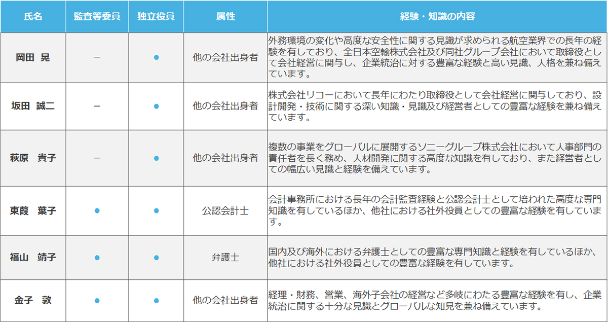 - 岡田晃、坂田誠二及び萩原貴子の各氏は、東京証券取引所の定めに基づく「独立役員」であります。