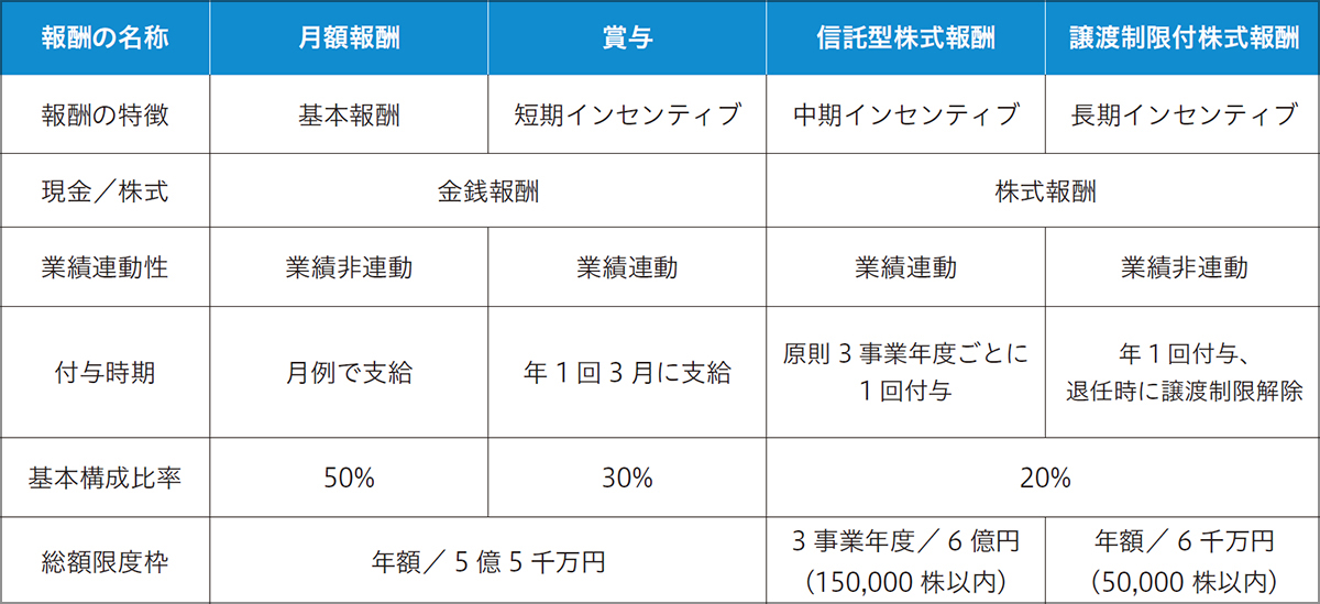 - 役員報酬は、固定報酬である基本報酬と会社業績、個人評価を反映する業績連動報酬から構成します。