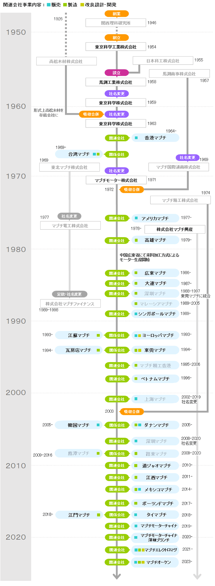 マブチモーターの歴史は、創業者の馬渕健一が1946年(昭和21)に香川県高松市に設立した「関西理科研究所」に始まります。 その後、野村トーイ社との取引開始をきっかけに上京した健一・隆一兄弟が、1954年(昭和29)東京都葛飾区に設立した東京科学工業株式会社がマブチモーターの前身となりました。